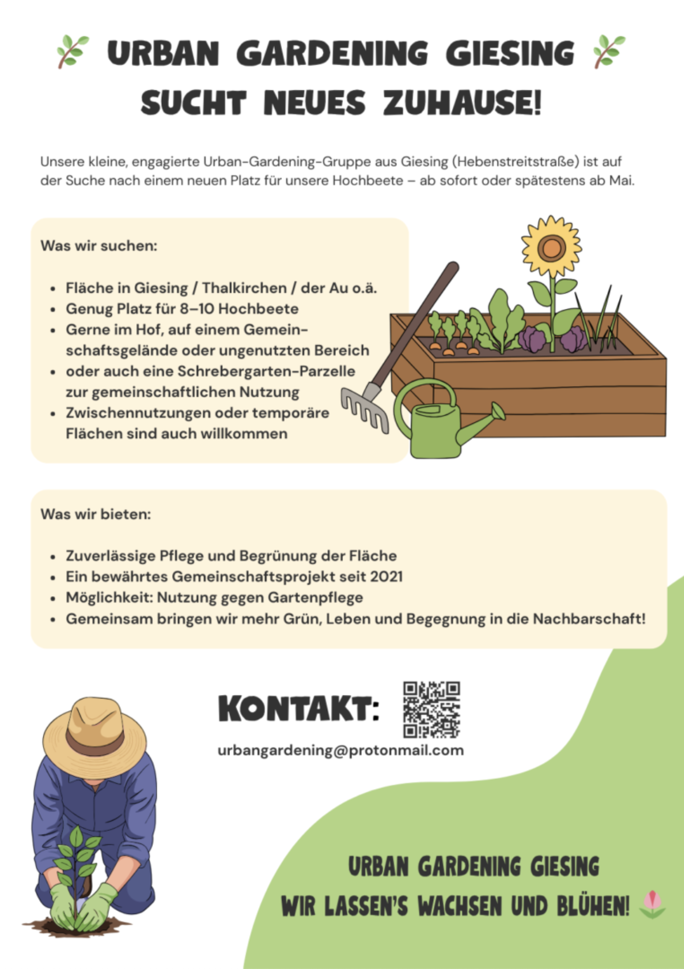 unser Urban Gardening Projekt in Untergiesing muss leider sein derzeitiges Gelände verlassen, da es bebaut werden soll. Deshalb suchen wir für unsere Hochbeete einen neuen Standort. Über Hinweise auf mögliche Stellflächen würden wir uns sehr freuen.